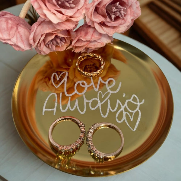 Crafted from high-quality metal with a polished metallic surface, this gold trinket tray adds a luxurious touch to any bedside table, vanity, dresser, or bathroom counter. Whether you're using it to hold your engagement ring, wedding band, earrings, or daily accessories, this dish keeps everything safe while serving as a constant reminder of love and devotion.