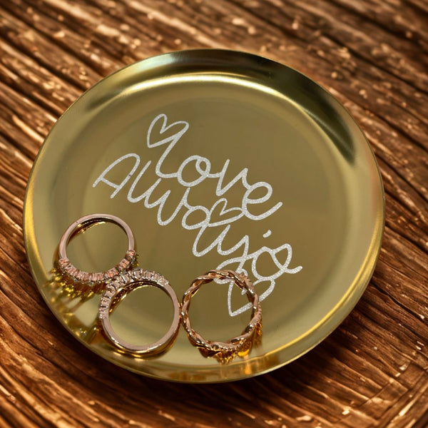 Bring everyday elegance and a heartfelt message to your jewellery storage with our Gold Round Jewellery Dish featuring the loving words “Love Always” in radiant white shimmer vinyl. With a sleek, reflective gold finish and a compact 10cm diameter, this dish is the perfect blend of function and sentiment, designed to keep your most cherished pieces beautifully organised and always within reach.